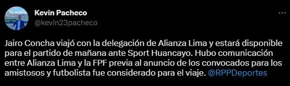 “Jairo Concha viajó con la delegación de Alianza Lima y estará disponible para el partido de mañana ante Sport Huancayo. Hubo comunicación entre Alianza Lima y la FPF previa al anuncio de los convocados para los amistosos y el futbolista fue considerado para el viaje”. Mencionó el comunicador social, que maneja excelente información sobre el equipo del pueblo. Que ahora se impuso ante el poder máximo de nuestro país.
