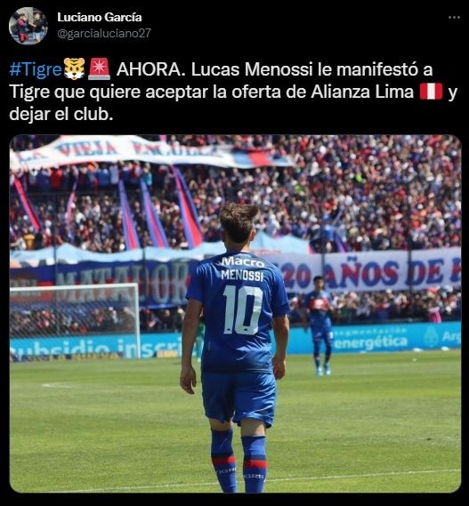 El periodista Luciano García, comunicó en su cuenta de Twitter la última actualización sobre este caso: “AHORA. Lucas Menossi le manifestó a Tigre que quiere aceptar la oferta de Alianza Lima y dejar el club. Lo contamos con Guillermo Cardozo”, explicó el popular comunicador social.
