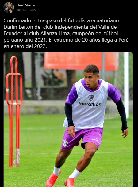 El periodista deportivo del Diario Líbero, José Varela, fue claro en ese aspecto, develando detalles de esta contratación: “Confirmado el traspaso del futbolista ecuatoriano Darlin Leiton del club Independiente del Valle de Ecuador al club Alianza Lima, campeón del fútbol peruano año 2021. El extremo de 20 años llega a Perú en enero del 2022”.