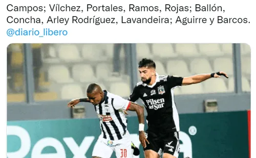 “Con Arley Rodríguez y Jefferson Portales, el equipo de Alianza Lima que iniciará el juego ante César Vallejo mañana en Matute. Campos; Vílchez, Portales, Ramos, Rojas; Ballón, Concha, Arley Rodríguez, Lavandeira; Aguirre y Barcos”, reveló el periodista José Varela del diario Líbero.