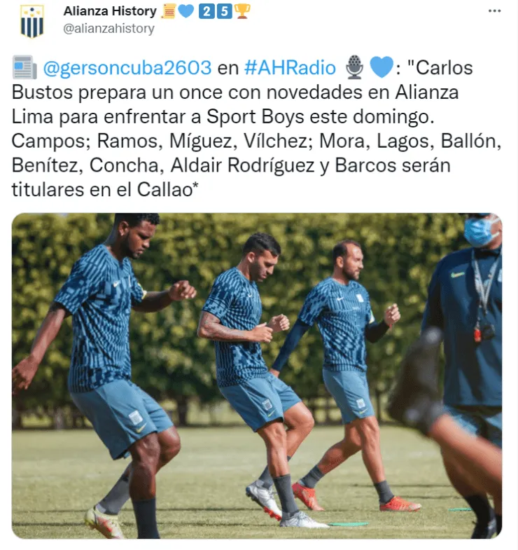 “Carlos Bustos prepara un once con novedades en Alianza Lima para enfrentar a Sport Boys este domingo. Campos; Ramos, Míguez, Vílchez; Mora, Lagos, Ballón, Benítez, Concha, Aldair Rodríguez y Barcos serán titulares en el Callao”, revelóGerson Cuba en el programa digital Alianza History.