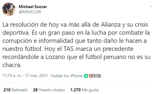 “La resolución de hoy va más allá de Alianza y su crisis deportiva. Es un gran paso en la lucha por combatir la corrupción e informalidad que tanto daño le hacen a nuestro fútbol. Hoy el TAS marca un precedente recordándole a Lozano que el fútbol peruano no es su chacra”, señaló en sus redes el comunicador.