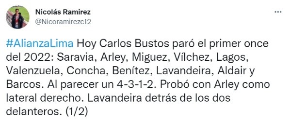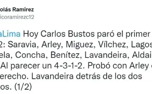 El hombre de prensa también acotó que: “Al parecer un 4-3-1-2. Probó con Arley como lateral derecho. Lavandeira detrás de los dos delanteros. El sábado disputarán un amistoso ante Cantolao. Vale aclarar que Campos, Ramos, Mora, Ballón y Farfán están con la selección”, finalizó Nicolás Ramírez en su cuenta de Twitter la información sobre Alianza Lima.