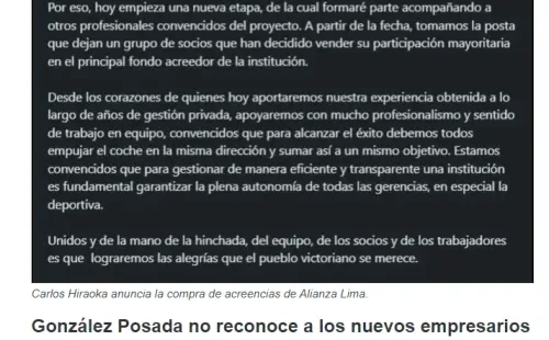 La acreencia de Alianza Lima fue comprada por Carlos Hiraoka. Este último, que también es el actual gerente general de GW Yichang & CIA desde el año 2010. Y el mismo empresario peruano fue el que anunció y confirmó esta grata noticia a través de su LinkedIn oficial.