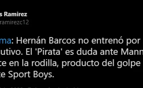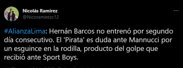 Así lo comenta el comunicador con información ‘blanquiazul’: “Hernán Barcos no entrenó por segundo día consecutivo. El ‘Pirata’ es duda ante Mannucci por un esguince en la rodilla, producto del golpe que recibió ante Sport Boys”. Generando preocupación en los fanáticos ‘íntimos’.