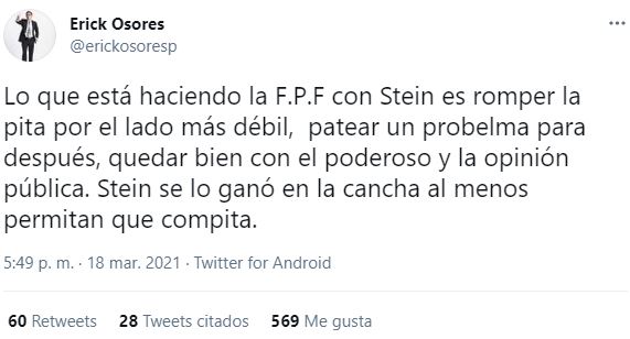 Para el peridista Erick Osores, la FPF simplemente evita un problema por el momento: “Lo que está haciendo la F.P.F con Stein es romper la pita por el lado más débil, patear un probelma para después, quedar bien con el poderoso y la opinión pública. Stein se lo ganó en la cancha al menos permitan que compita”, indicó el conductor en su cuenta de Twitter.