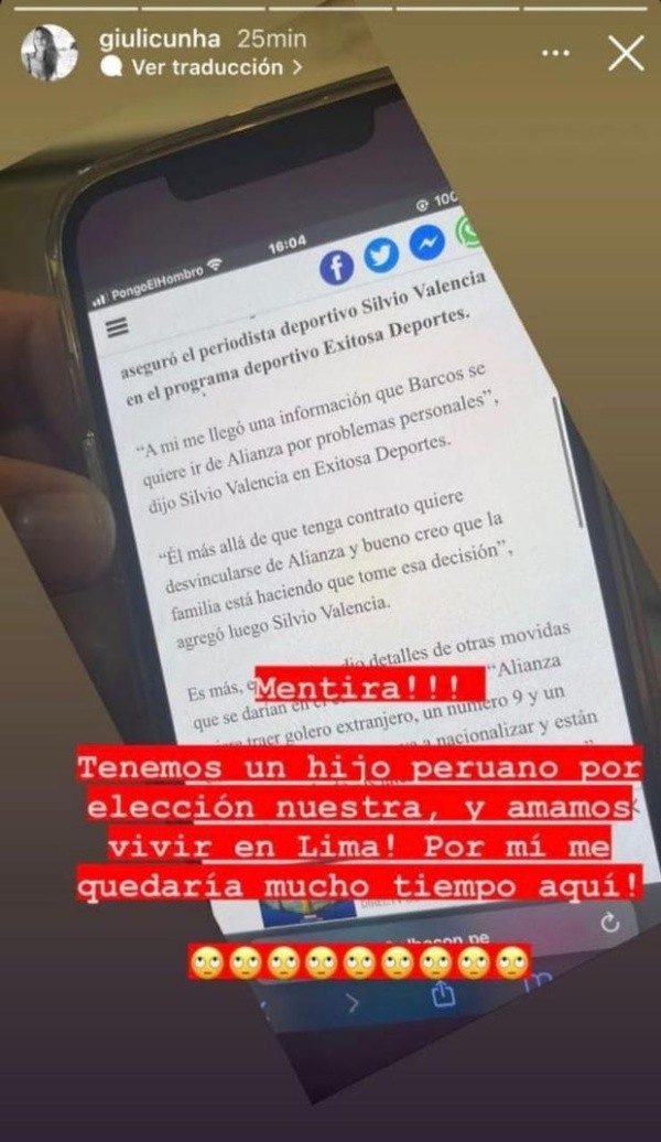 La esposa del futbolista subió una foto en su historia de Instagram donde decía: “Mentira. Tenemos un hijo peruano por elección nuestra y amamos vivir en Lima. Por mi me quedaría mucho tiempo aquí”, fue lo que publicó la cónyuge del delantero desmintiendo al periodista con supuesta noticia ‘bomba’ en ese momento. Esta sería una ‘patinada’ más del periodista Silvio Valencia quien también había dicho que Jefferson Farfán llegaría a Deportivo Municipal antes que a Alianza Lima.