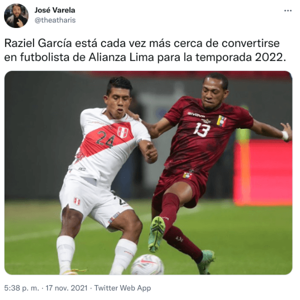 “Raziel García está cada vez más cerca de convertirse en futbolista de Alianza Lima para la temporada 2022”, escribió el mencionado comunicador en sus redes sociales. Así, un seleccionado nacional podría ponerse la Blanquizul ¡Sería tremendo refuerzo!