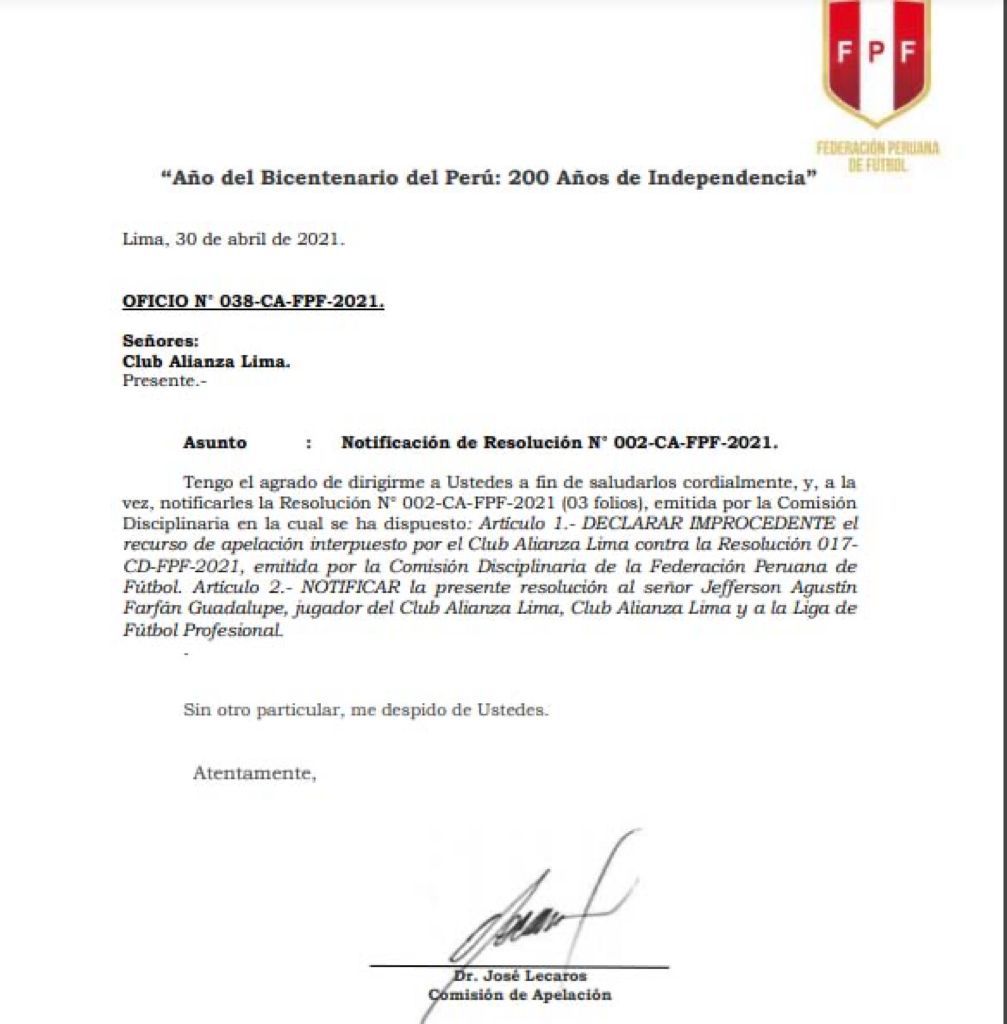 Mediante un comunicado la Federación Peruana de Fútbol rechazó el pedido de Alianza Lima para que se cancele el castigo de Jefferson Farfán, quien fue suspendido por 2 fechas por romper los protocolos sanitarios.