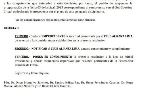 “La Carta ingresada por el Club Alianza Lima, por la Ventanilla Virtual de Trámites de la Federación Peruana de Fútbol, con fecha 03 de febrero de 2023, mediante la cual solicita a la Comisión Disciplinaria la suspensión del partido de la fecha 03 contra el Club Sporting Cristal por la Liga 1 2023 – Apertura, por no contar con las garantías para su realización”, inicia el documento.