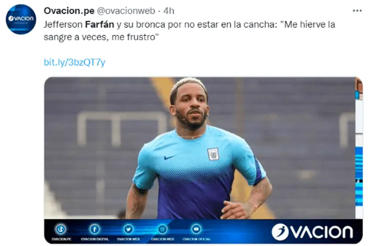 Cabe resaltar que elúltimo partido que disputó Jefferson Farfán con la camiseta blanquiazul fue el 28 de noviembre del año pasado, en el empate sin goles ante Sporting Cristal, resultado que le valió a Alianza Lima proclamarse campeón de la temporada 2021 de la Liga 1.
