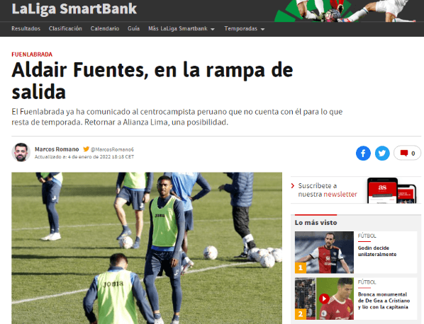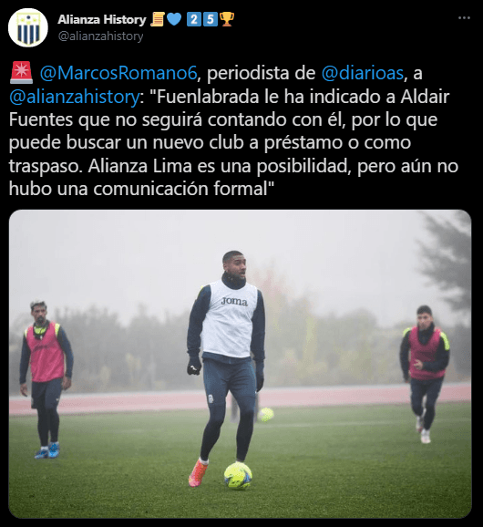 Así lo comentó el periodista del ‘Diario AS’, Marcos Romano, quien charló con los amigos de ‘Alianza History’, señalando lo siguiente: “Fuenlabrada le ha indicado a Aldair Fuentes que no seguirá contando con él, por lo que puede buscar un nuevo club a préstamo o como traspaso. Alianza Lima es una posibilidad, pero aún no hubo una comunicación formal”.