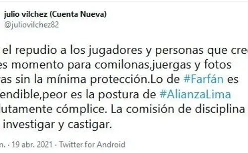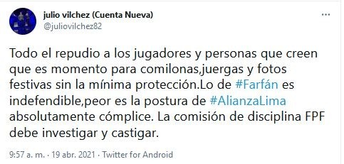 “Todo el repudio a los jugadores y personas que creen que es momento para comilonas, juergas y fotos festivas sin la mínima protección. Lo de Farfán es indefendible, peor es la postura de Alianza Lima absolutamente cómplice. La comisión de disciplina FPF debe investigar y castigar“, disparó.