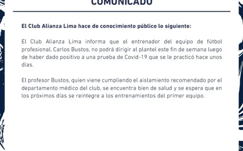 En Alianza Limadieron la noticia a través de una nota de prensa. “El Club Alianza Lima informa que el entrenador del equipo de fútbol profesional, Carlos Bustos, no podrá dirigir al plantel este fin de semana, luego de haber dado positivo a una prueba de COVID-19 que se le practicó hace unos días”, publicóla institución.