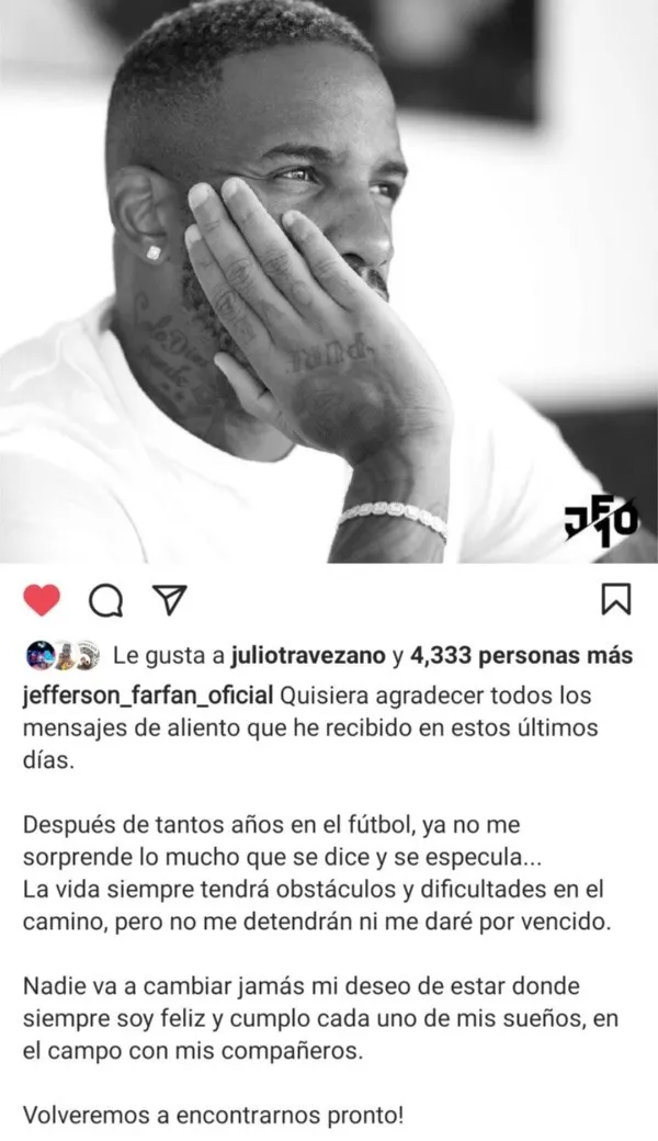 Mediante un mensaje en Instagram, Jefferson Farfán indicó que volverá a las canchas: “Nadie va a cambiar jamás mi deseo de estar donde siempre soy feliz y cumplo cada uno de mis sueños, en el campo con mis compañeros. Volveremos a encontrarnos pronto!”.
