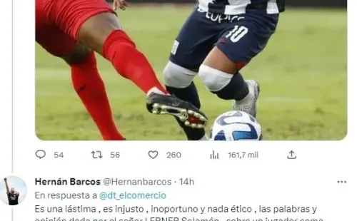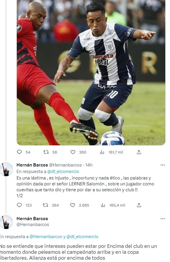“Es una lástima, es injusto, inoportuno y nada ético, las palabras y opinión dadas por el señor Lerner Salomón, sobre un jugador como Cueva, que tanto tiene por dar a su selección y club”, escribó Hernán Barcos en su cuenta de Twitter respondiendo a una nota del Diario El Comercio.