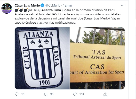 Este miércoles 17 de marzo, la información trascendió. El TAS le dio la razón a Alianza Lima. Le quitó dos puntos a Carlos Stein y determinó que Alianza Lima se mantendrá en primera división.