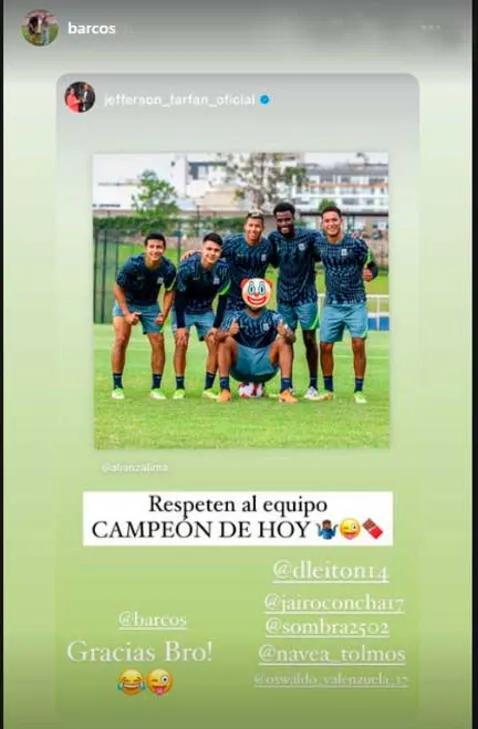 ‘El 10 de la calle’ subió una historia juntos a sus compañeros del fútbol reducido, demostrando que ganaron junto a una descripción divertida: “Respeten al equipo campeón de hoy”. Apareciendo Farfán junto a Leiton, Concha, Ramos y Valenzuela. Y arrobó a Hernán Barcos, sin saber la respuesta.