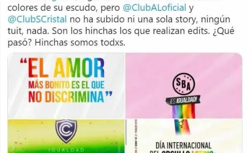 En el caso de Alianza brillaron por su silencio. Un periodista como Brandon Távara lo hizo notar: “Equipos del mundo se han pronunciado sobre el #DiaDelOrgullo , algunos incluso han cambiado los colores de su escudo, pero Alianza Lima y Cristalno ha subido ni una sola story, ningún tuit, nada. Son los hinchas los que realizan edits. ¿Qué pasó? Hinchas somos todxs”.