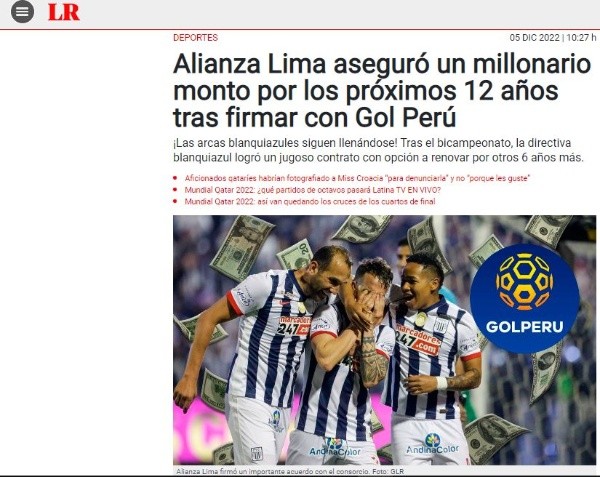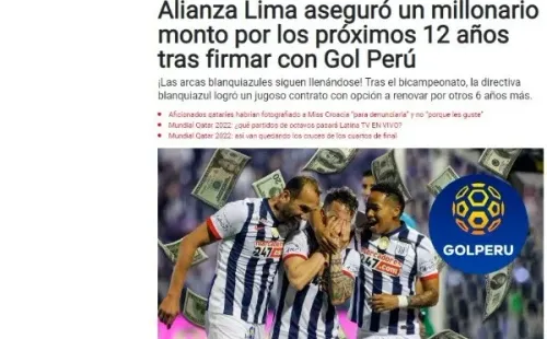 Así comienza el artículo del mencionado medio de comunicación: “Acuerdo histórico no solo para el club, sino también para el fútbol peruano! En medio de la guerra por los derechos de televisión —pues la Federación Peruana de Fútbol firmó un acuerdo con 1190 Sports para que transmita la Liga 1 2023—, Alianza Lima logró un trato con Gol Perú por los próximos 12 años con opción a renovar por otras seis temporadas más, con lo que se adjudicó un millonario monto”.
