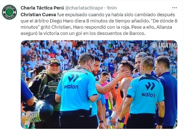 Sucediendo sobre los últimos minutos del partido, Christian Cueva reclamó por qué se agregaron ocho minutos en el final del cotejo entre Alianza Lima y Unión Comercio. En ese sentido, y tras avisarle al juez principal de lo que dijo, el árbitro Diego Haro expulsó al delantero.