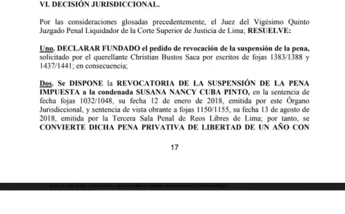 Asimismo, en el documentose confirmó la duración de la sanción:“Se convierte dicha pena privativa de libertad de un año con ocho meses, en pena privativa de libertad efectiva, cuyo cómputo se iniciará cuando la sentenciada condenada Susana Nancy Cuba Pinto”.