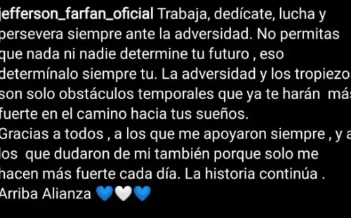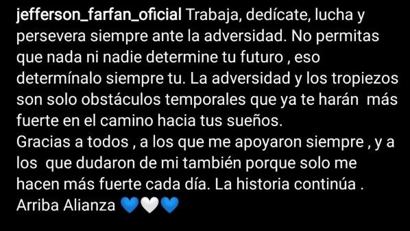 Finalmente, se acercó a cada uno de los seguidores, para agradecer cada momento de calidad que le brindaron en forma de saludos, cuando ‘La Foquita’ aún estaba de para: “Gracias a todos, a los que me apoyaron siempre, y a los que dudaron de mí también, porque solo me hacen más fuerte cada día. La historia continúa. Arriba Alianza”.