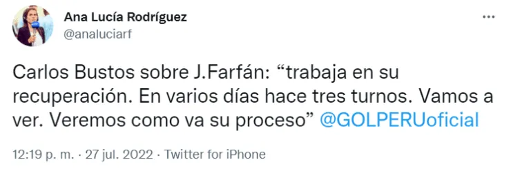Es por ello que este lunes, tras el triunfo de 1-0 del cuadro ‘blanquiazul’ ante Alianza Atlético, Carlos Bustos fue consultado por el estado del exjugador del Lokomotiv, y sobre la posibilidad de salir en lista para el duelo ante Sporting Cristal, yesto fue lo que dijo en una nota con GolPerú:“Jefferson trabaja en su recuperación. En varios días hace tres turnos. Vamos a ver. Veremos como va su proceso”.