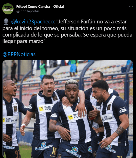 “Jefferson Farfán no va a estar para el inicio del torneo, su situación es un poco más complicada de lo que se pensaba. Se espera que pueda llegar para marzo”. Mencionó el comunicador social, con información especializada de Alianza Lima, y los hinchas no lo pueden entender.