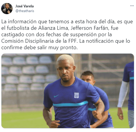 “La información que tenemos a esta hora del día, es que el futbolista de Alianza Lima, Jefferson Farfán, fue castigado con dos fechas de suspensión por la Comisión Disciplinaria de la FPF. La notificación que lo confirme debe salir muy pronto”. Así lo hizo saber el periodista peruano que conoce a Alianza Lima al revés y derecho. Cobertura al equipo íntimo desde hace muchas temporadas.