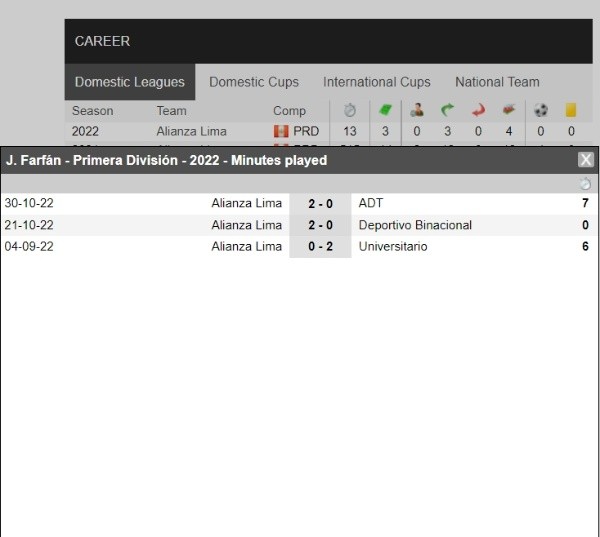 Basándonos en lo que ha venido mostrando en los tres últimos cotejos que ha disputado durante la temporada 2022, Jefferson Farfán en total ha estado 13 minutos en el campo de juego. Teniendo seis minutos ante Universitario de Deportes, ingresando en el suplementario ante Deportivo Binacional y contando con seis ante ADT de Tarma, es válido decir que la ‘Foquita’ no está para más de diez minutos.