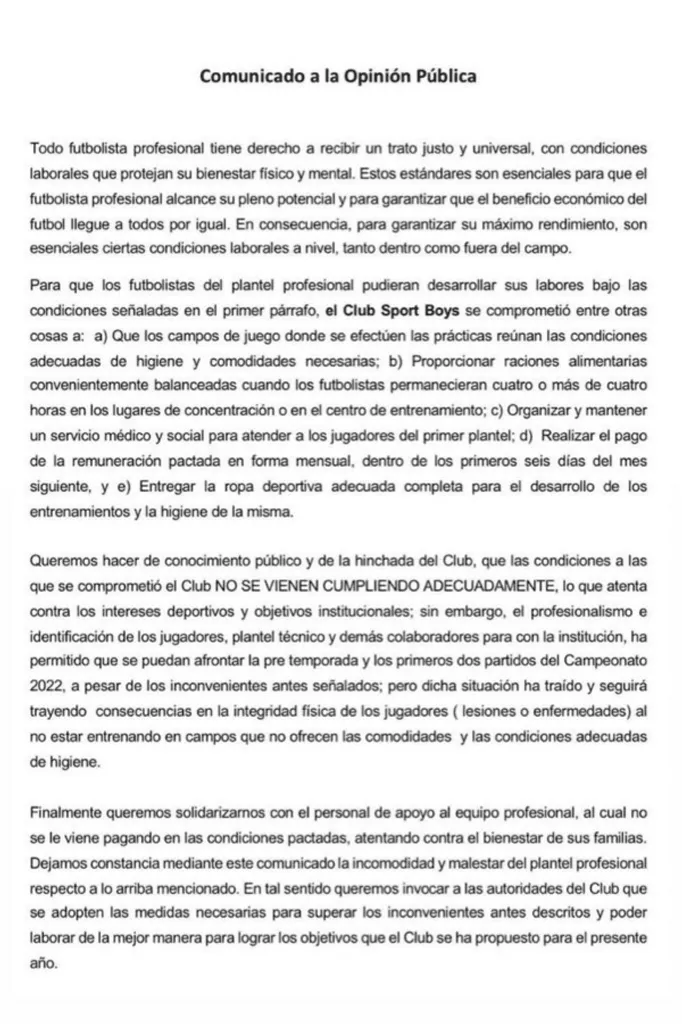 Los futbolistas también expresaron su solidaridad con el personal de apoyo al equipo profesional, que no viene recibiendo su remuneración pactada, lo cual afecta a sus familias. Finalmente, el plantel de Sport Boys instó a las autoridades de la institución a adoptar las medidas necesarias para superar los inconvenientes antes descritos y poder laborar de la mejor manera.