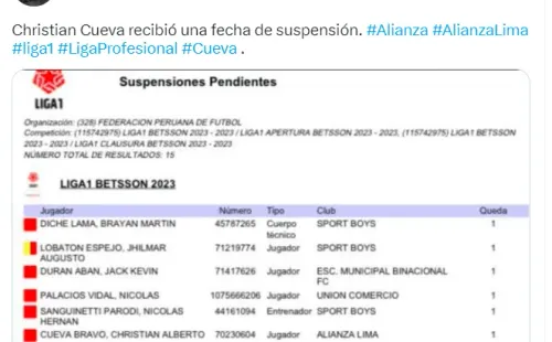“Christian Cueva recibió una fecha de suspensión”, escribió el comunicador en su cuenta de twitter, con una imagen donde se muestra la cantidad de fechas que le tocará estar fuera del campo.