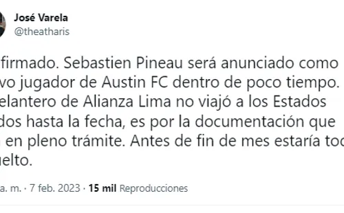 “Confirmado. Sebastien Pineau será anunciado como nuevo jugador de Austin FC dentro de poco tiempo. Si el delantero de Alianza Lima no viajó a los Estados Unidos hasta la fecha, es por la documentación que está en pleno trámite. Antes de fin de mes estaría todo resuelto”, publicó el comunicador.