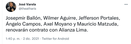 “Josepmir Ballón, Wilmer Aguirre, Jefferson Portales, Ángelo Campos, Axel Moyano y Mauricio Matzuda renovarán contrato con Alianza Lima”, señaló el mencionado comunicador en su twitter. Seguramente, se anuncien más continuidades.