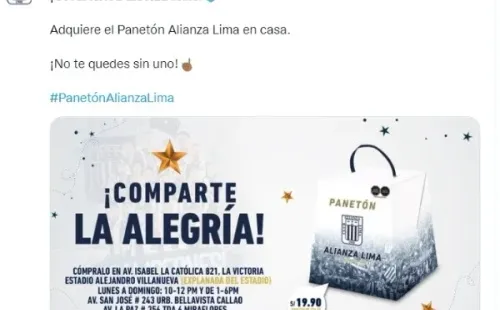 Brindando más información en la publicación, el cuadro íntimo de Alianza Lima también reveló el punto principal de venta de sus clásicos panetones: Avenida Isabel La Católica 821 – La Victoria, estadio Alejandro Villanueva (explanada del estadio Matute). También precisando la hora, se pueden conseguir de lunes a domingo de 10 a 12 PM. y de 1 a 6 PM.