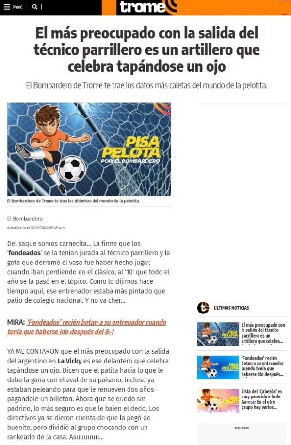 “YA ME CONTARON que el más preocupado con la salida del argentino en La Vicky es ese delantero que celebra tapándose un ojo. Dicen que el patita hacía lo que le daba la gana con el aval de su paisano, incluso ya estaban peleando para que le renueven dos años pagándole un billetón“, comienza en su relato El Bombardero del Diario Trome.