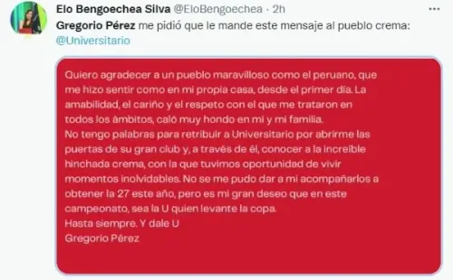 En ese sentido, la periodista Elo Bengoechea publicó en su cuenta de Twitter, un mensaje de despedida de Gregorio Pérez. El técnico uruguayo habría confiado una carta a la comunicadora de GOLPERU, para que ella la haga llegar a toda la hinchada ‘crema’. En palabras conmovedoras y de aliento para el club, el ‘Goyo’ le dijo adiós a Universitario de Deportes.