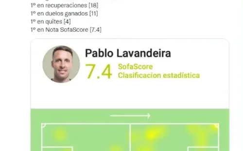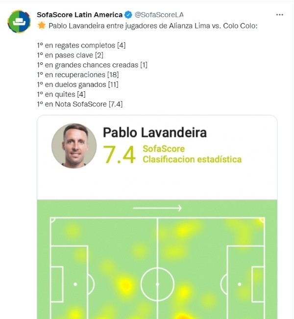El volante de Alianza Lima tuvo buenos números en su partido por la Copa Libertadores donde fue el primero en lo siguiente: Obtuvo 4 regates completos, dio dos pases claves, creó una gran chance para su equipo, obtuvo 18 recuperaciones a lo largo del cotejo, salió victorioso en 11 duelos y tuvo 4 quites del balón. Tras todo lo nombrado SofaScore le puso un 7.4 de nota global a Pablo Lavandeira.