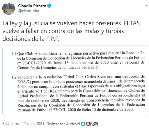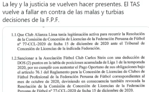 Y es que el Tribunal Arbitral Deportivo se manifestó sobre al caso de los Íntimos contra la FPF y Carlos Stein. La búsqueda pasaba por que le quiten al menos un punto a los carlistas.