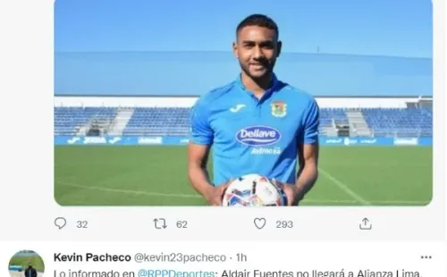 “Aldair Fuentes no llegará a Alianza Lima. Club blanquiazul no llegó a un acuerdo con Fuenlabrada para la vuelta del mediocampista. Equipo español solicitaba que se resigne totalidad de la deuda para que se dé la incorporación. Alianza Lima no aceptó”, reveló Kevin Pacheco en el programa ‘Fútbol Como Cancha’ deRPP Noticias.
