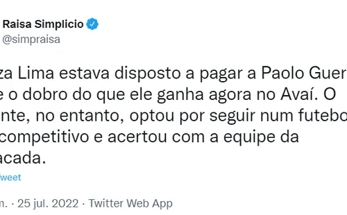 “Alianza Lima estaba dispuesto a pagarle a Paolo Guerrero casi el doble de lo que gana ahora en Avaí. El delantero, sin embargo, optó por seguir en un fútbol más competitivo y acertó con el equipo de Resacada”, fue lo que indicó la conocida periodista brasileña en su cuenta de Twitter.