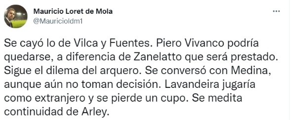 Así pues, el efecto dominó que generó la confirmación de que Pablo Lavandeira sí ocupará una plaza de extranjero repercutió directamente en el atacanteFranco Zanelatto. El delantero paraguayo sería prestado pues los cupos de jugadores internacionales estarían destinados a otros futbolistas. De esta forma, Piero Vivanco sí se quedaría en Alianza Lima, mientras que Franco Zanelatto buscaría otro club.