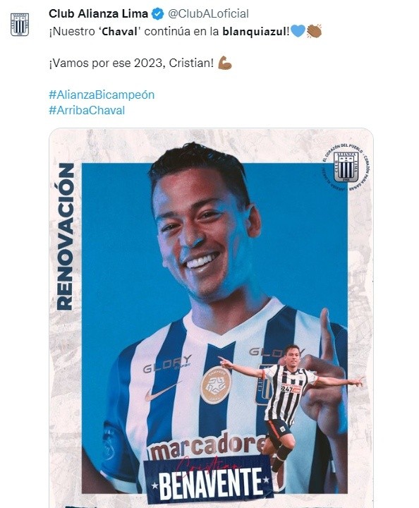 Así lo hizo saber Alianza Lima a través de sus redes sociales. Colocando una imagen la mañana de este jueves 22 de diciembre, el plantel íntimo anunció la continuidad del mediocampista Cristian Benavente. Habiendo llegado en la temporada 2022, y estrenándose con un gol, ahora el volante tiene la oportunidad de seguir haciendo historia en el fútbol peruano.