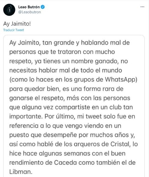 Lo que escribió el arquero de Alianza Lima que se retiró a inicios de año fue:”Ay Jaimito, tan grande y hablando mal de las personas que te trataron con mucho respeto, ya tienes un nombre ganado, no necesitas hablar mal de todo el mundo (como lo haces en los grupos de WhatsApp) para quedar bien”.
