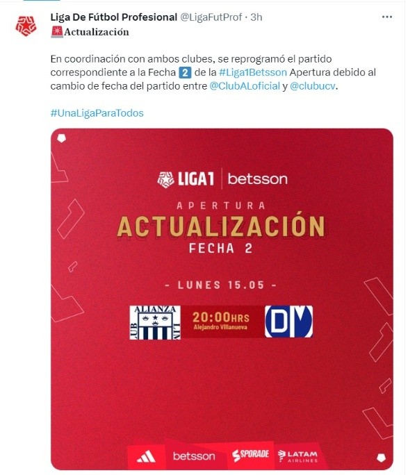 Resolviendo día y hora del encuentro pendiente por la fecha 2 del Torneo Apertura 2023 de la Liga 1, la directiva del campeonato determinó que Alianza Lima y el cuadro de Deportivo Municipal choquen este lunes 15 de mayo.