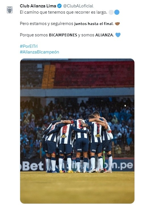 “El camino que tenemos que recorrer es largo, pero estamos y seguiremos juntos hasta el final porque somos bicampeones y somos Alianza“, publicaron las redes sociales de Alianza Lima la mañana de este lunes 20 de marzo.