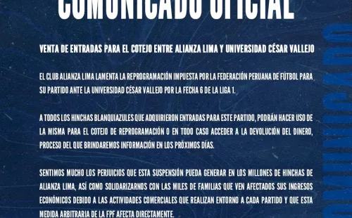 Comunicando que pronto se anunciará la reprogramación del partido, Alianza Lima no se quedó de brazos cruzados y expuso su malestar en una contundente publicación vía redes sociales: “El Club Alianza Lima lamenta la reprogramación impuesta por la Federación Peruana de Fútbol para su partido ante la Universidad César Vallejo por la fecha 6 de la Liga 1“, empezó el comunicado.