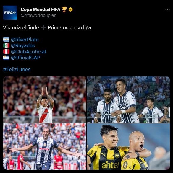 Con un precioso mensaje y fotografías para el recuerdo: “Victoria el finde. Primeros en su liga”. Anexando a River Plate de Argentina, Rayados de Monterrey en México, Peñarol de Uruguay. Y al representante peruano, Alianza Lima. Con el cierre idóneo de “Feliz Lunes”.