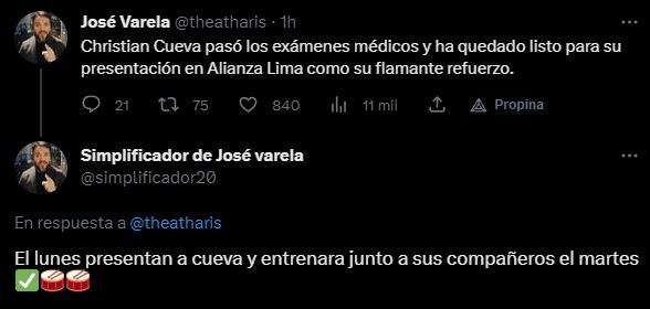 Así lo cuenta el comunicador social: “Christian Cueva pasó los exámenes médicos y ha quedado listo para su presentación en Alianza Lima como su flamante refuerzo. El lunes presentan a Cueva y entrenará junto a sus compañeros el martes”. Entonces, solo queda esperar un poquito más, ya todo está hecho. Finiquitada, la contratación más importante de todos los tiempos, según algunos especialistas.